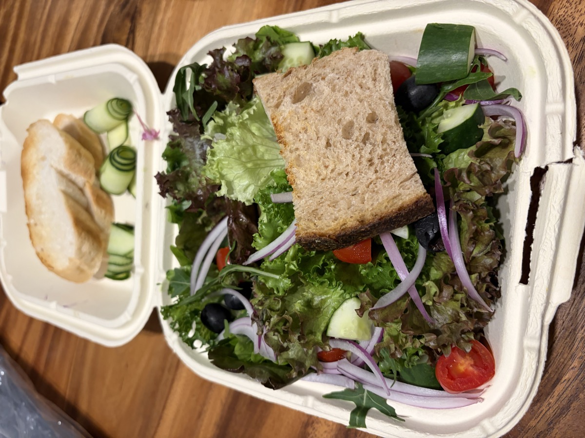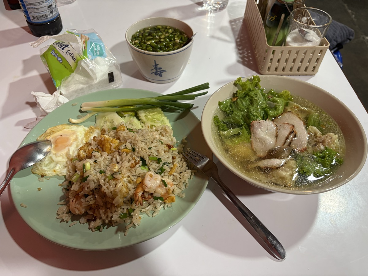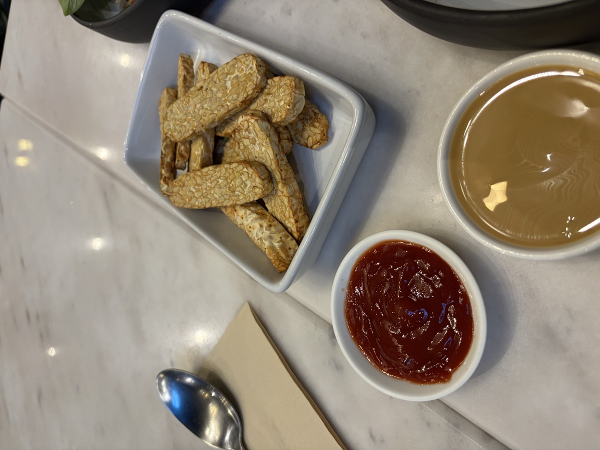11:00 Thai Vegan Plate (Rice rolls in tofu skin with vegetables + peanut sauce), Fried Tempeh side ~30g, Thai Rice Noodle Soup (wide noodles, chicken, bean sprouts, peanuts, cilantro, mushrooms)