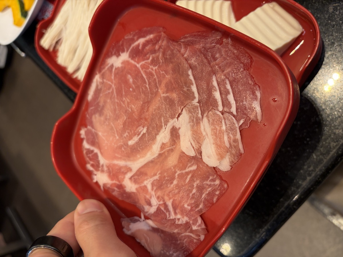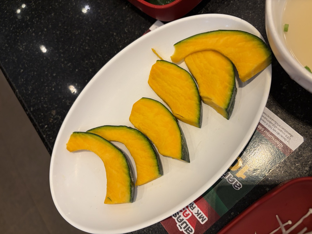 13:23 MK Restaurant: Kao Na Moo Daeng (Chinese Roast Pork on Rice), Shabu-shabu (Pork 150g, Tofu 100g, Enoki Mushrooms 80g, Kabocha Pumpkin 120g, Chinese Spinach 80g)