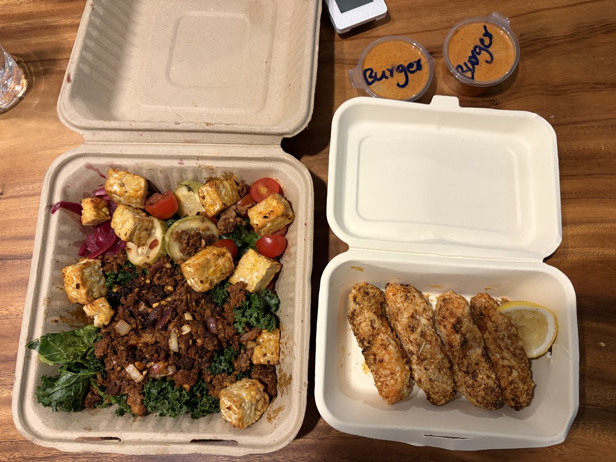 13:32 Healthy Junk Beef Burger Bowl (Tempeh 100g topping, Rice 160g), Homemade Miso Soup (Tofu 200g, King Oyster Mushrooms 60g, Enoki Mushrooms 20g, Daikon Radish 54g, Carrot 30g, Miso 1 tbsp)