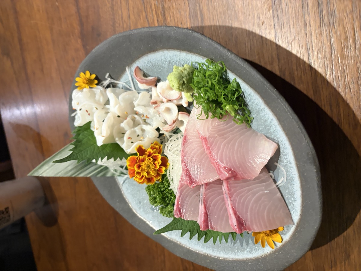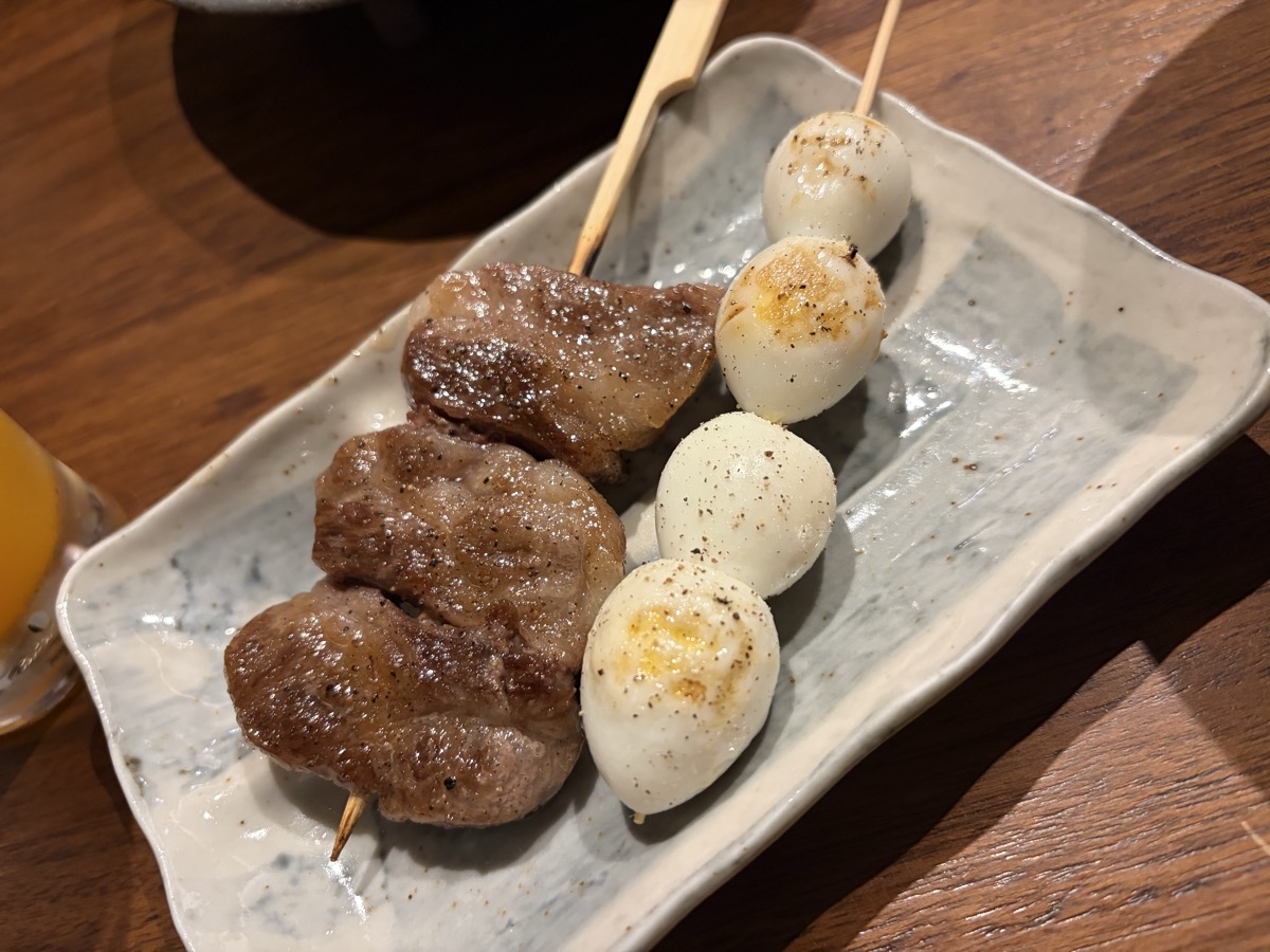 20:00 Izakaya dinner: Orange Juice 250ml, Niku Soba 1 bowl, Sashimi plate (Squid 80g + Hamachi 100g), Grilled Oyster 1, Kushiyaki (Beef skewer ~60g + Quail Egg skewer 3pc), Pork Roll skewers 2pc