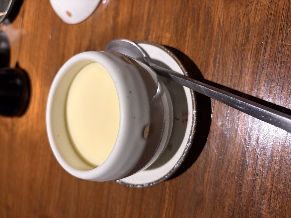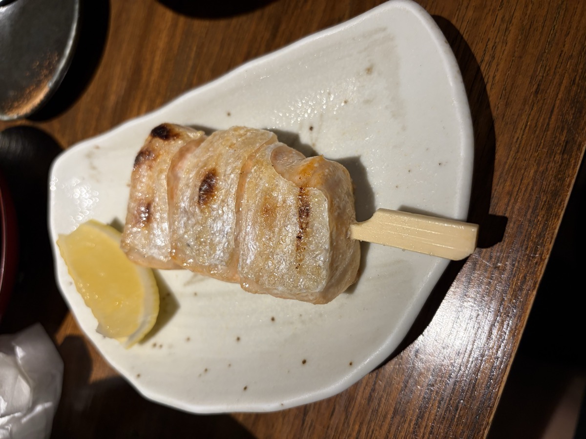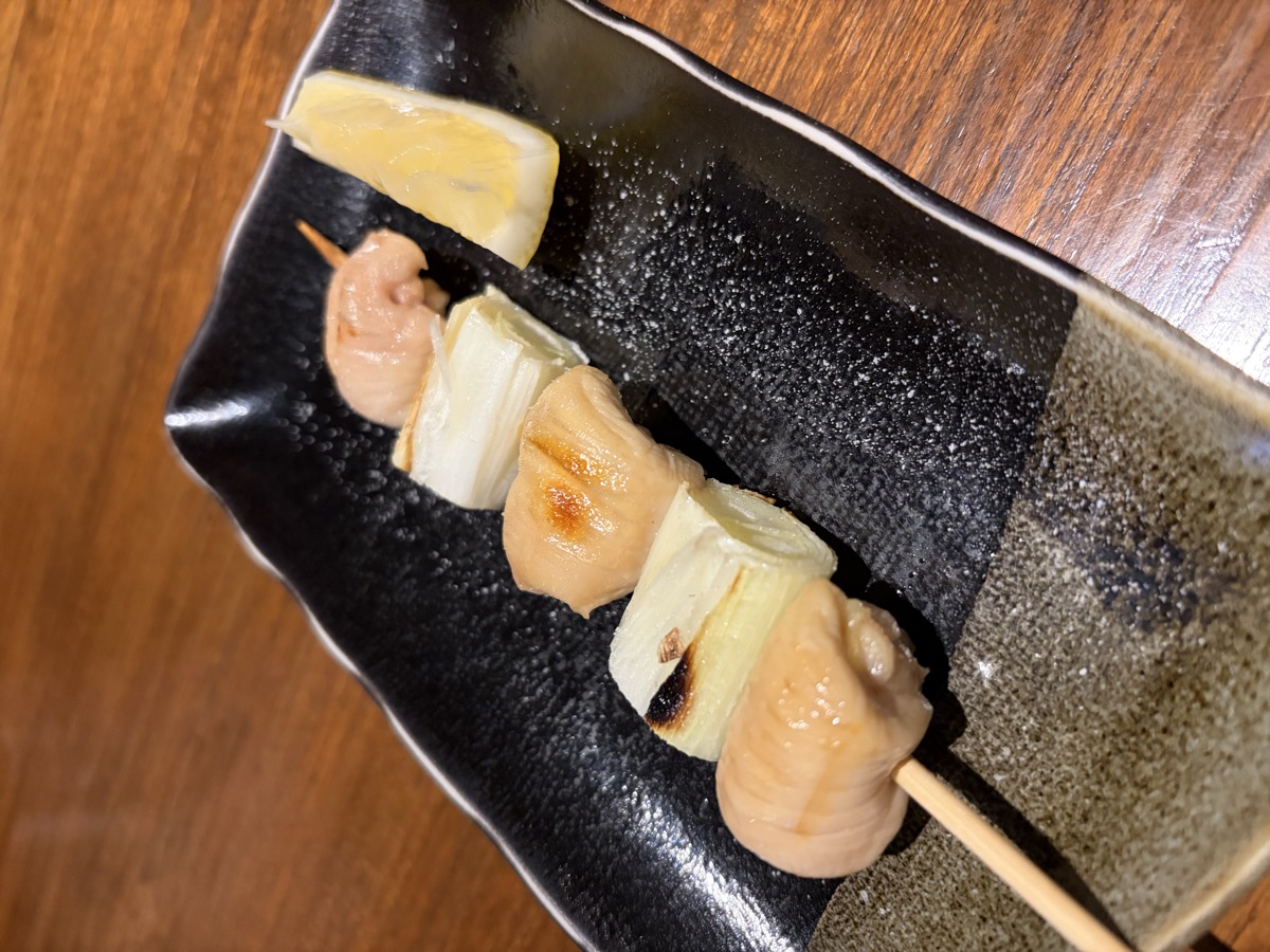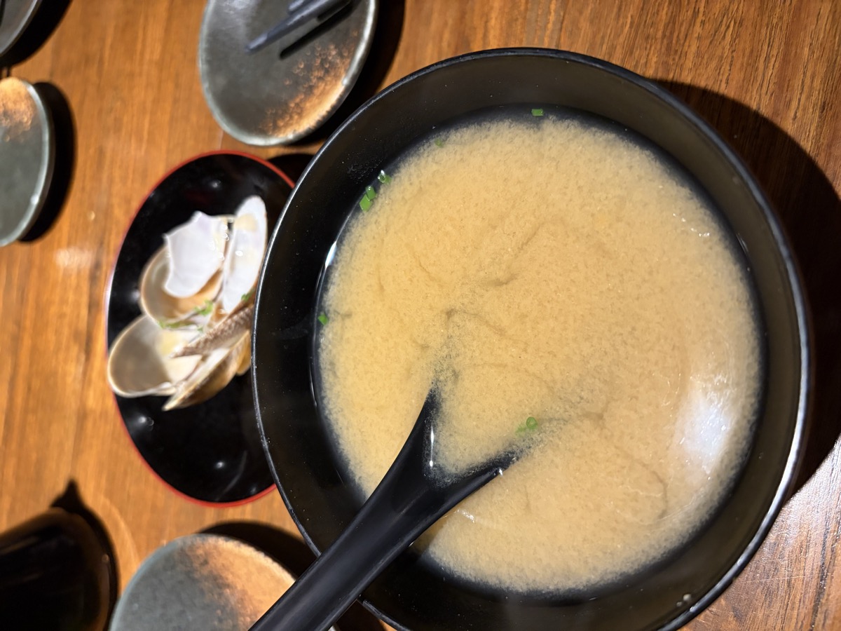 20:00 Izakaya dinner: Clam Miso Soup, Pork Fat Wrap skewer ~80g, Udon with Wakame + Soft-boiled Egg + Nori + Tenkasu, Chicken Negima skewer, Chawanmushi