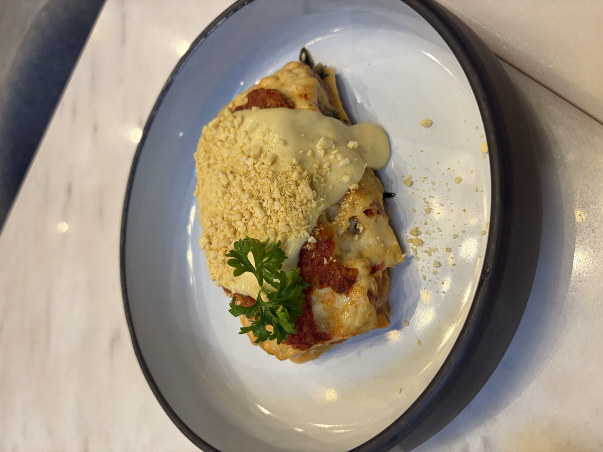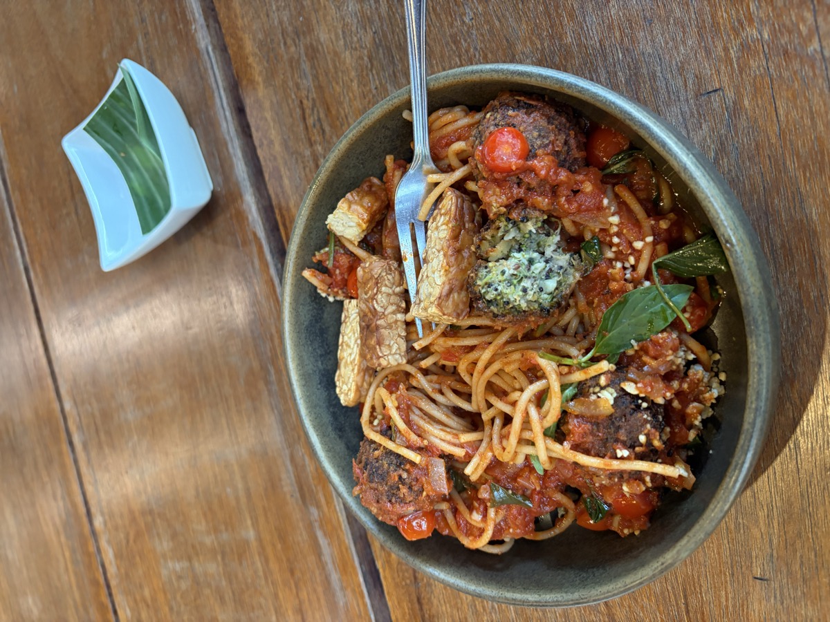 13:00 Vegan Spaghetti Pomodoro ~350g (with veggie meatballs + parmesan + basil), Fried Tempeh side ~50g