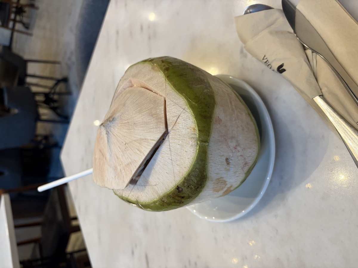 18:00 Young Coconut (water + flesh), Som Tam (Thai papaya salad) 1 serving, Eggplant Parmigiana 1 serving, Fried Tempeh side + Latte