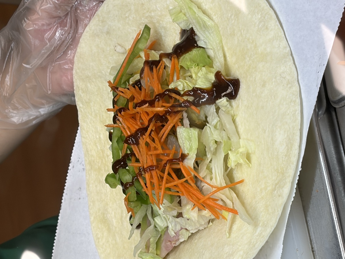 20:00 Thai Pork Congee (Jok) 1 bowl, Shawarma-style Wrap (tortilla, chicken, vegetables, BBQ sauce)