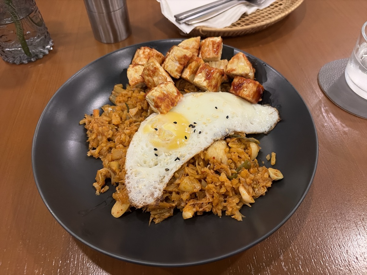 20:00 Kimchi Fried Rice, Halloumi Cheese cubes ~60g, Fried Egg 1